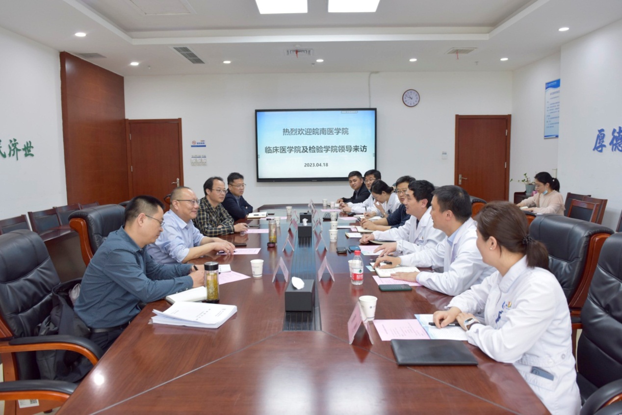 安徽医科大学附属阜阳医公司党委副书记、经理胡孔旺及相关职能科室负责人接待了傅万山一行。双方就医学人才的培养及校院进一步合作进行了深入交流。