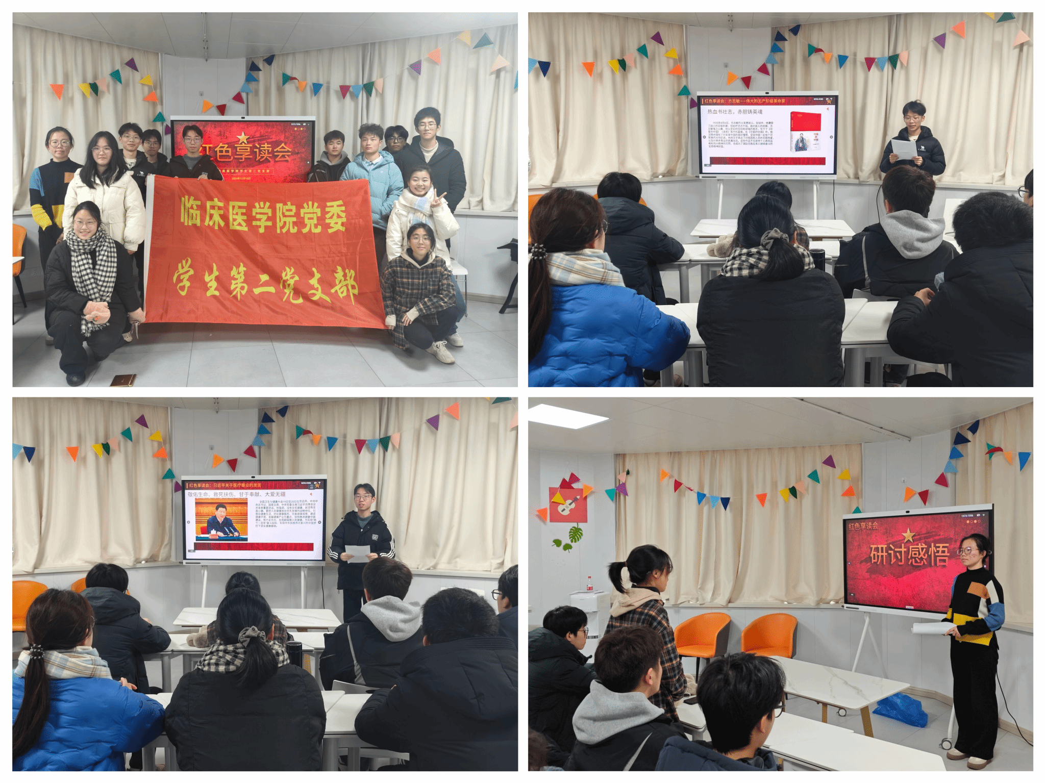 12月23日,支部在“一站式”员工社区开展“红色享读会”活动。活动分为品读红色经典著作和研讨感悟两个板块,同学们分享选读了《毛泽东选集》《可爱的中国》《习近平的七年知青岁月》及习近平总书记关于卫生健康工作重要论述相关内容,结合历史与时代背景深刻剖析了其蕴含的丰富内涵与现实意义。研讨交流环节,大家积极讨论、踊跃发言,纷纷表示将不断从红色经典中汲取精神养分与经验智慧,坚定理想信念,锤炼顽强意志,为推进健康中国建设贡献青春力量。