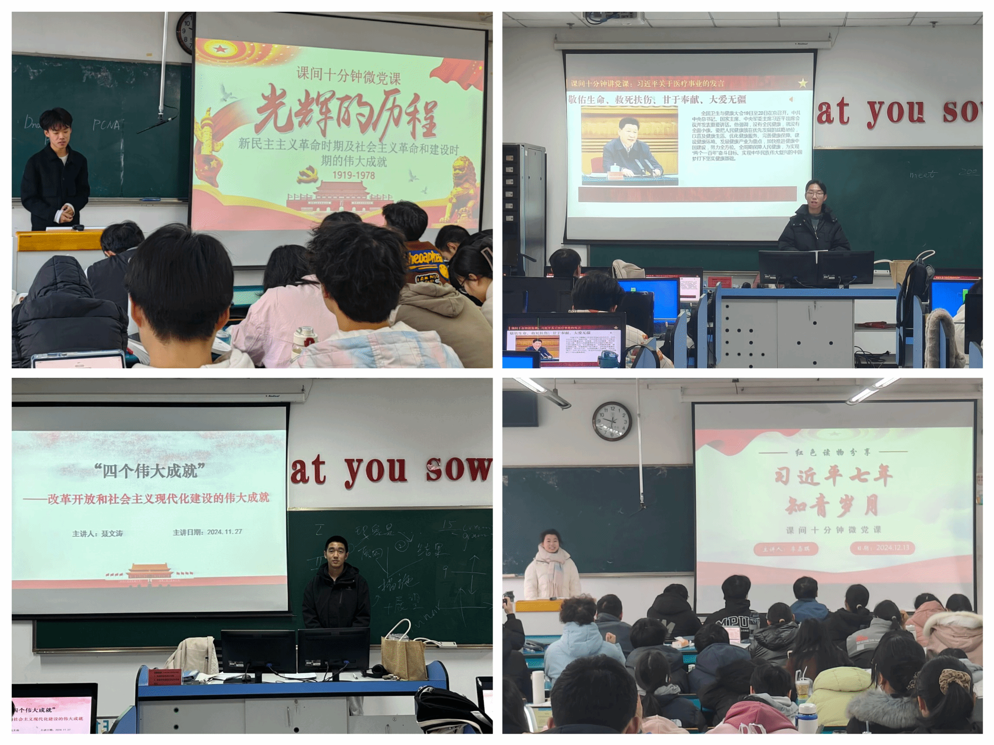 近一个月以来,支部共组织开展20余场“课间10分钟讲党史”活动,入党积极分子们围绕党史关键事件、英雄人物事迹、红色经典故事,带领同学们重温了中国共产党走过的百年光辉岁月和艰苦历程。通过以微见深、简洁明快的学习形式,使同学们对于党史学习产生浓厚兴趣,充分且深刻地认识到中国共产党百年征程中的砥砺奋进,以及站在新的历史起点上青年一代踔厉奋发的使命与担当。