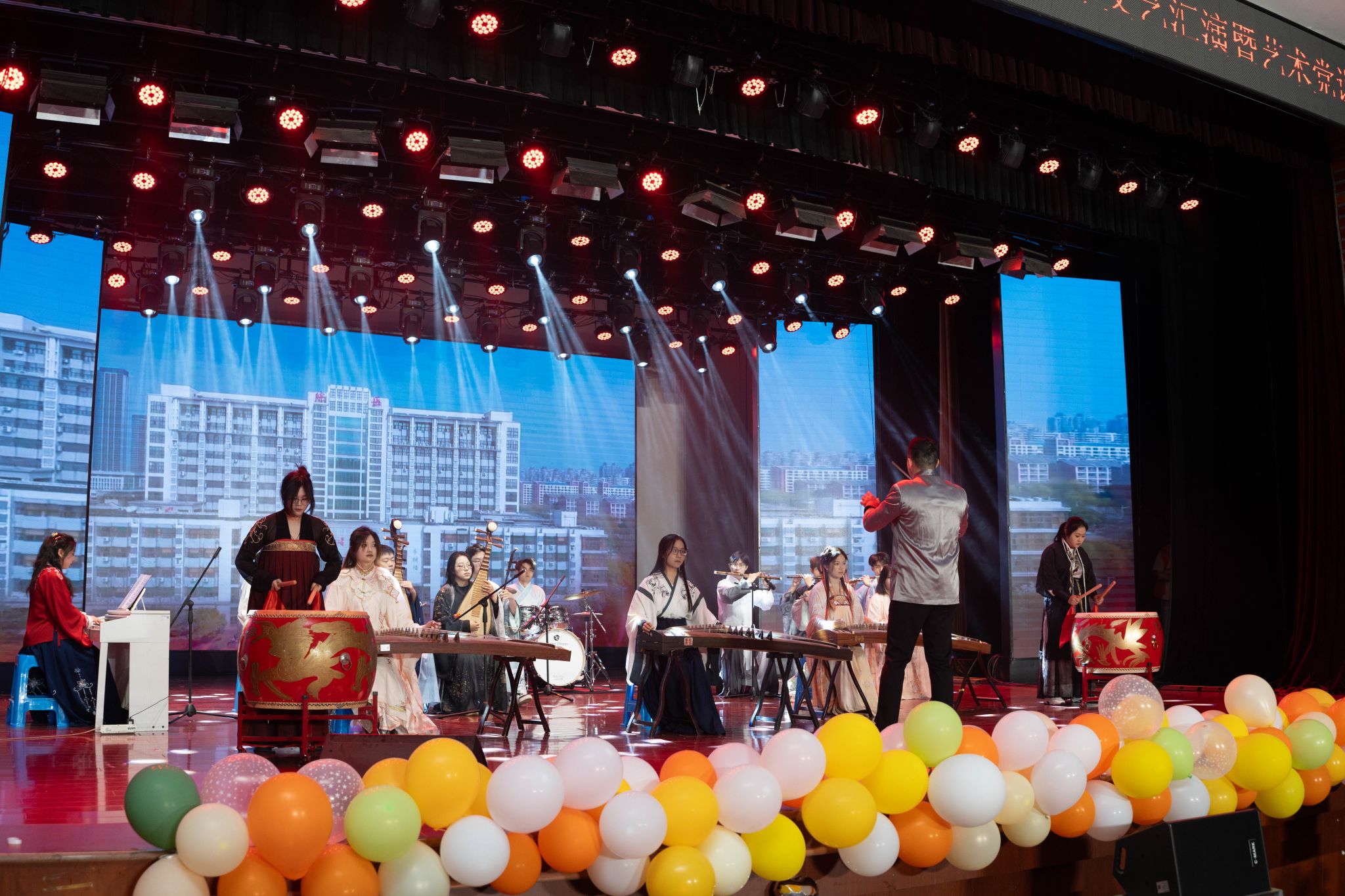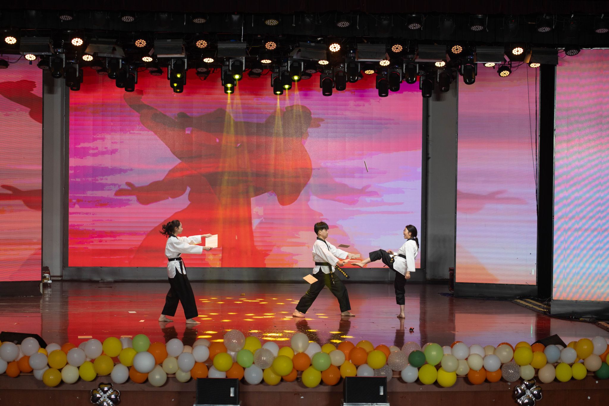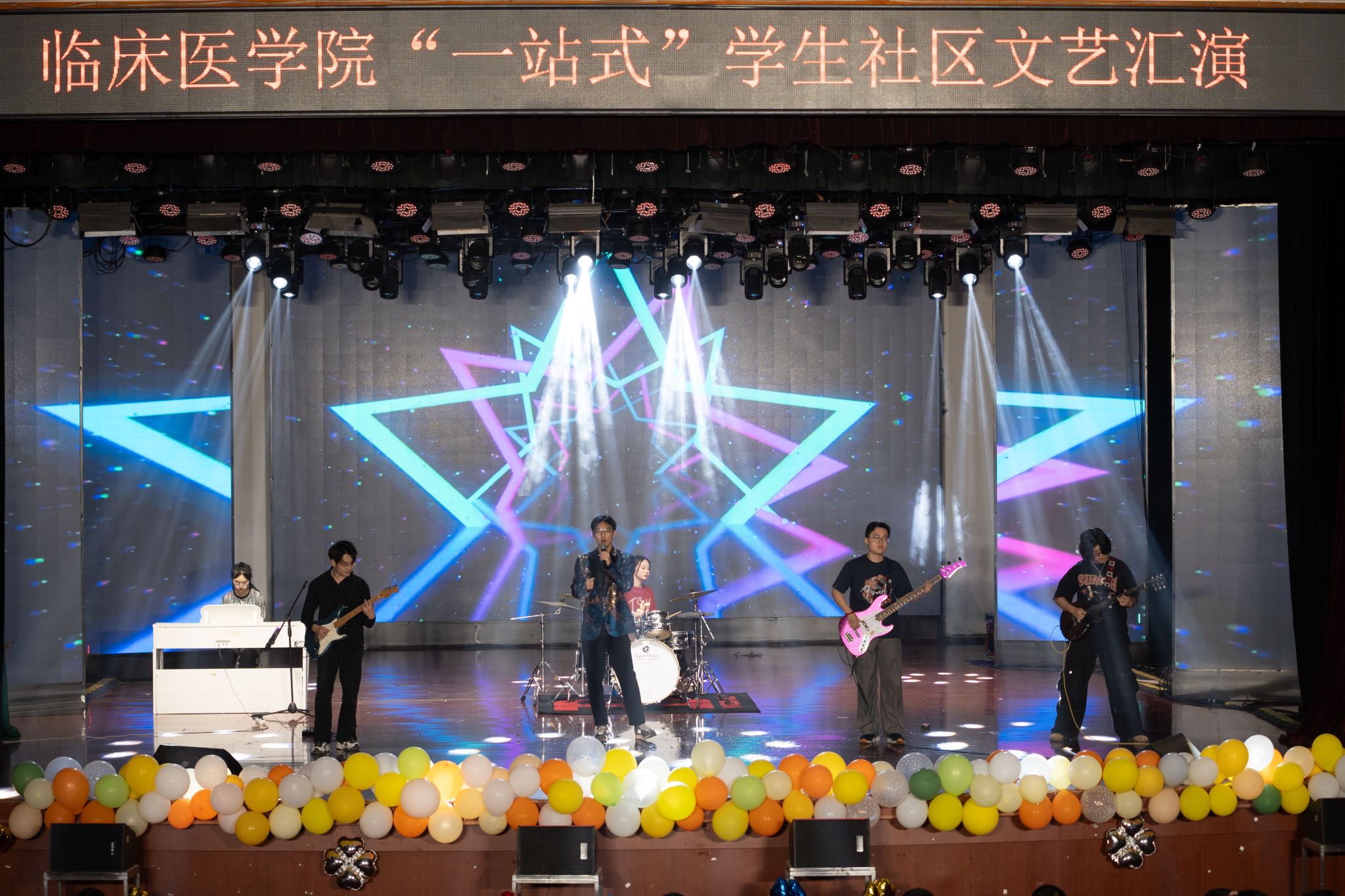 晚会在一曲豪迈洒脱、荡气回肠的乐器合奏《世间始终你好》中拉开序幕,民族乐器的演绎诠释了经典曲目的全新魅力。舞台剧《追光者—医员工的成长历程》以真挚的情感和细腻的表演,呈现了一名医员工从懵懂入学到坚定职业信仰的成长故事,展现了医员工群体的奋斗历程与精神传承。新疆籍员工倾情演绎的歌舞《疆舞皖情》成为一大亮点,他们身着民族服饰,伴随欢快的旋律翩然起舞,为观众带来一场跨越地域的艺术对话。歌曲串烧《青春共振》活力四射,跳跃的音符、动感舞步引爆全场热情。古典舞《丹心鉴·长明》以翩跹舞姿演绎传统文化底蕴,衣袖飞舞间尽显华夏风骨。魔术表演《奇迹之旅》以令人惊叹的魔幻时刻将晚会推向高潮,表演者带领观众开启了一段充满未知与惊喜的魔法旅程。《“跆”起未来》节目以力与美的完美结合震撼全场,表演者们用矫健的身姿和精湛的技艺,展现了跆拳道运动的独特魅力。心理剧《你就是自己的全世界》以细腻动人的表演引发师生共鸣,从自我否定到悦纳自我的心路历程,生动展现了当代老员工的成长蜕变。乐队将经典红歌与流行金曲创新融合,演绎了气势磅礴的《强军战歌》和活力四射的《第一天》,展现了新时代青年多元化的艺术追求。流行舞串烧《爱的主打歌》以活力四射的表演点燃全场。朗诵《五四星火·青春逐梦》以激昂的文字和饱满的情感震撼全场,将五四精神与当代青年的使命担当紧密相连。经典红歌联唱《游击队歌》《打靶归来》以磅礴的气势将晚会推向高潮,演员们用激昂的歌声带领全场观众重温革命岁月,展现了新时代青年赓续红色血脉的坚定信念。晚会在校歌合唱《为人类托起明天的太阳》的优美旋律中落下帷幕。