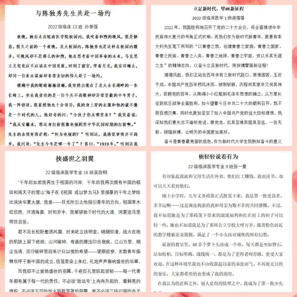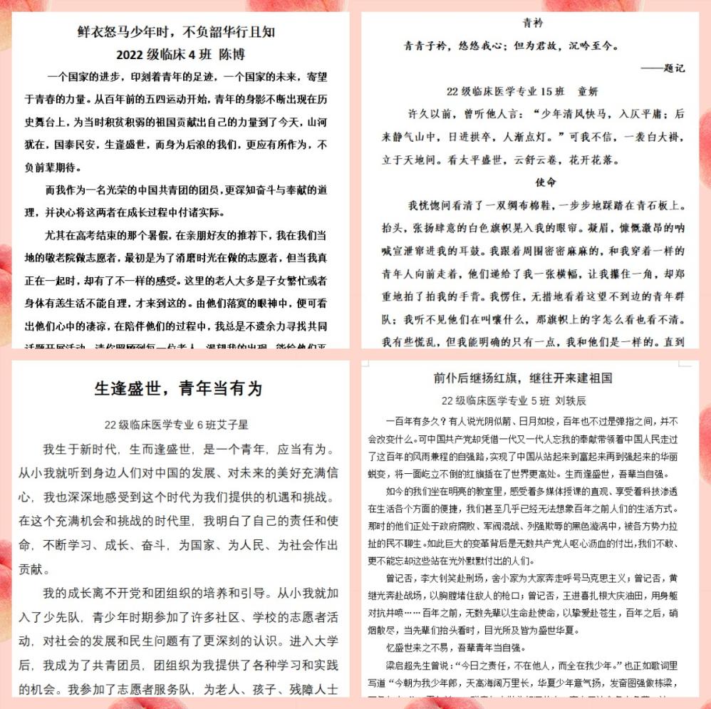 生而逢盛世,青年当有为。5月23日-6月6日,年级举办“生而逢盛世 青年当有为”征文比赛,旨在引导同学们以自己的视角、自己的语言、自己的体验、自己的方式表达对党和国家的爱。活动共收到作品60余件,作品形式新颖,内容丰富,各具特色,充分展现出临床学子有信仰、有责任、有担当、有情怀的精神面貌。经评审组严格认真筛选,评出征文一等奖3篇、二等奖6篇、三等奖9篇、优秀奖24篇。