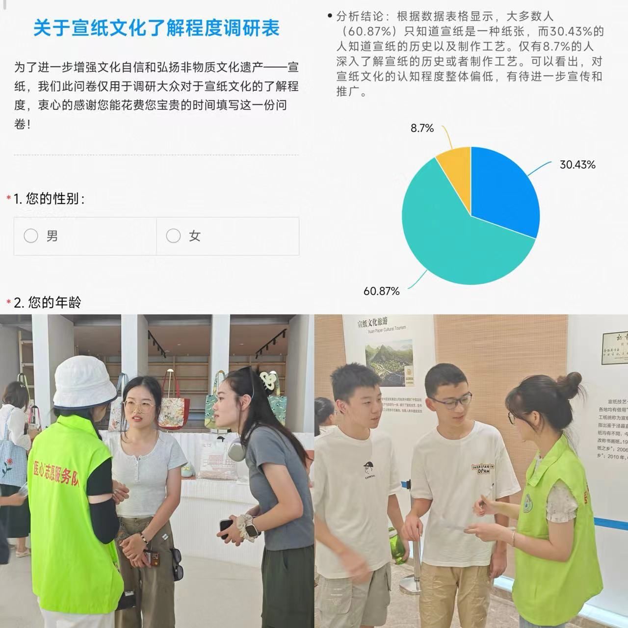 问卷寻梦,纸绘匠心为了更广泛地了解宣纸在群众中的认知度与影响力,团队成员通过发放问卷、现场采访等形式,开展了一场别开生面的宣纸文化调研活动。调研结果显示,虽然宣纸之名广为人知,但对其历史、制作工艺以及文化价值深入了解的人并不多,大众对宣纸文化的认知程度整体偏低。这一发现更加坚定了团队成员推广宣纸文化、提升公众文化自信的决心。