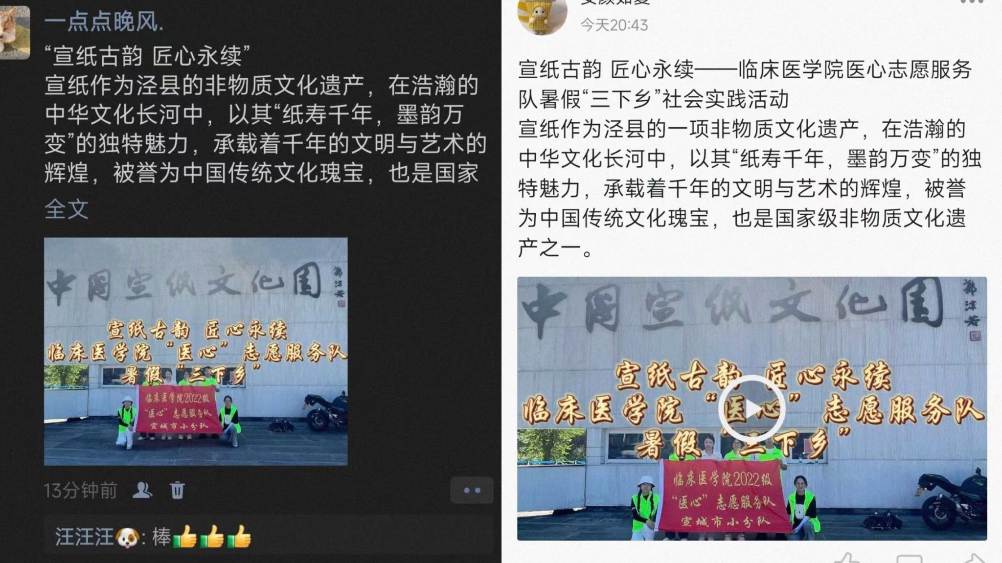 文脉相承,青春蓄力团队成员们深知宣纸文化宣传的使命与责任,活动结束后,大家通过社交媒体发布了关于此次传承宣纸文化的活动视频。视频展示了宣纸制作的精细过程、与大国工匠毛胜利师傅的交流以及团队成员的感悟。团队成员希望通过这一行动,将宣纸文化带到更广阔的平台,也让更多人了解并关注到这一宝贵的非物质文化遗产。他们以实际行动践行了“文脉相承,青春蓄力”的誓言,为中华文化的传承与发展贡献了青春力量。