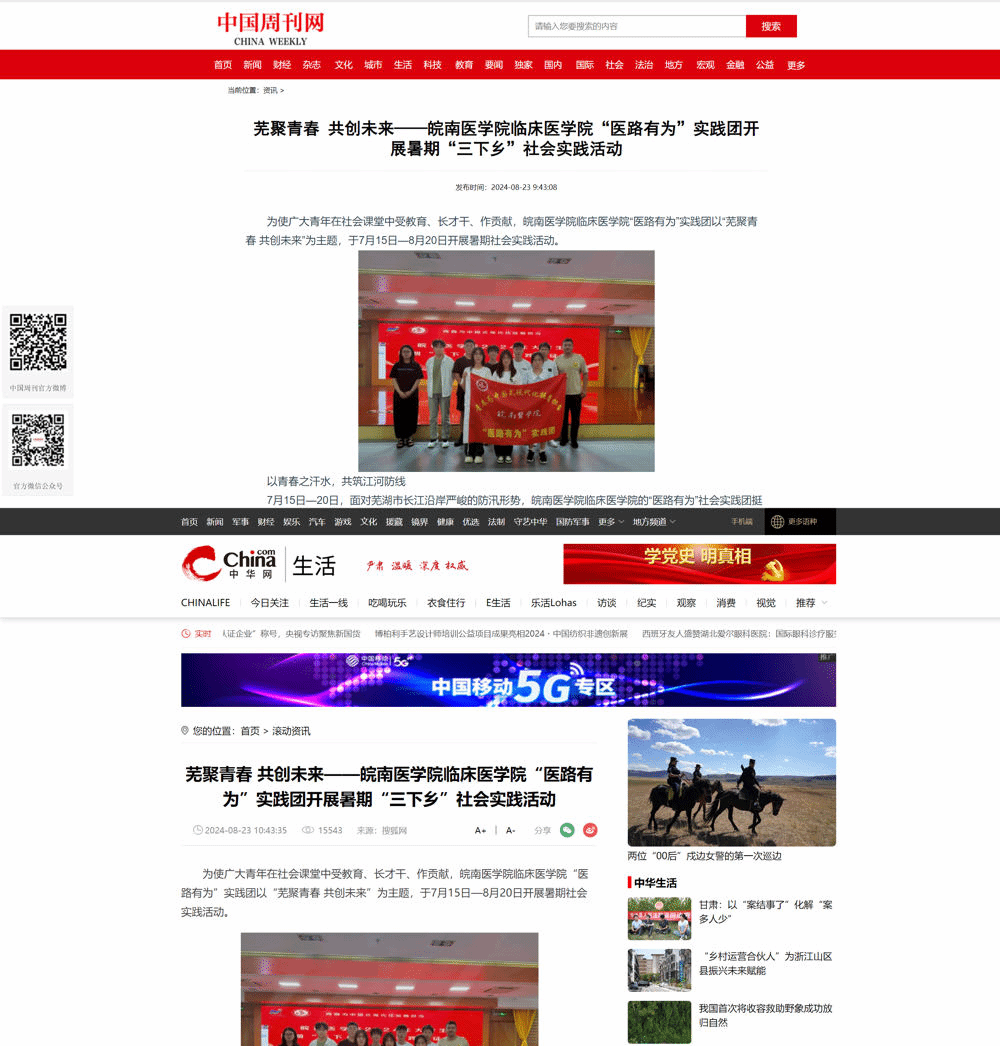 此次暑期“三下乡”社会实践活动受到中国周刊网、中华网等媒体的关注和报道。活动的开展不仅为同学们搭建了一座锻炼自我、奉献社会的桥梁,更为家乡振兴的宏伟画卷添上了浓墨重彩的一笔。未来,“医路有为”实践团将努力肩负起“服务社会、奉献国家”的崇高使命,激励更多有志青年投身到社会实践中,为中国式现代化建设贡献智慧与力量。(周宇鹍、苏曹骢/文 赵梓莹/摄 )