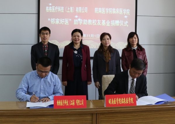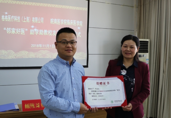 11月1日,举校同庆建校60周年之际,“邻家好医”助学助教员工基金捐赠仪式在行政会议室举行。“邻家好医”、格格医疗科技有限公司创始人罗林员工,云顶国际8588yd副经理郑兰荣,员工办公室主任赵梅,临床医公司党政领导、部分师生代表出席仪式。党委副书记、副经理李曙主持捐赠仪式。