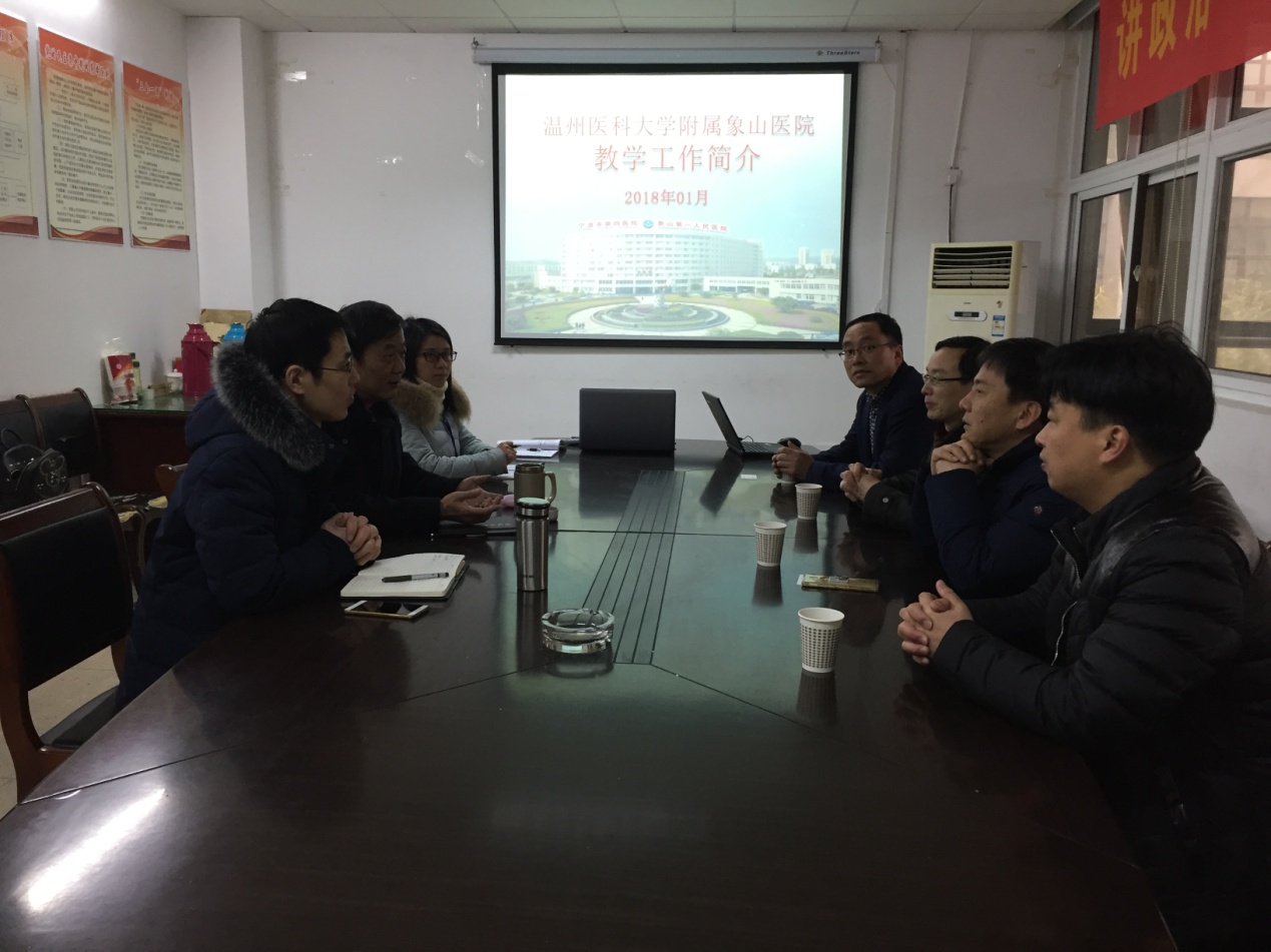 1月7日上午,浙江省宁波市象山县卫计局党委副书记、副局长史美德,象山县第一人民医院副经理谢龙腾,象山县第二人民医院经理孙忠敏以及象山县第二人民医院经理助理邱沿波等一行4人来公司云顶国际8588yd交流工作。临床医公司党委书记刘群、副经理李曙、教学工作秘书、员工工作秘书及2018届毕业班辅导员,在公司会议室热情接待了来宾。
