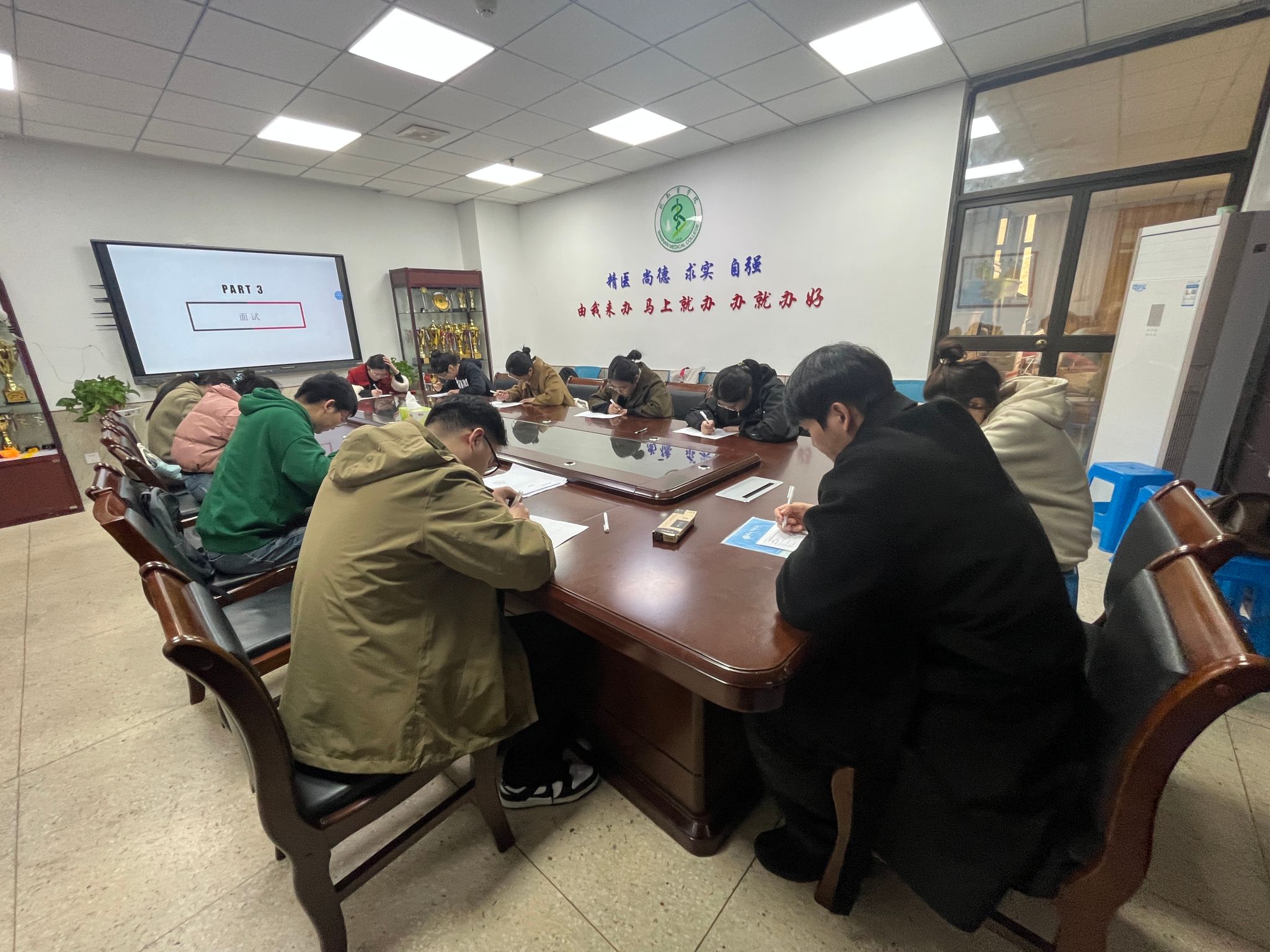 专场招聘会上,临床医学专业30名毕业生参加。王娟通过PPT宣讲的形式,介绍了院前急救体系、中心发展目标、人才需求、福利政策、招聘流程和发展路径等方面内容,并现场解答同学们的提问。宣讲结束后,经过笔试、面试、谈话等环节,最终有7名临床医学专业毕业生与上海市医疗急救中心签订就业协议。