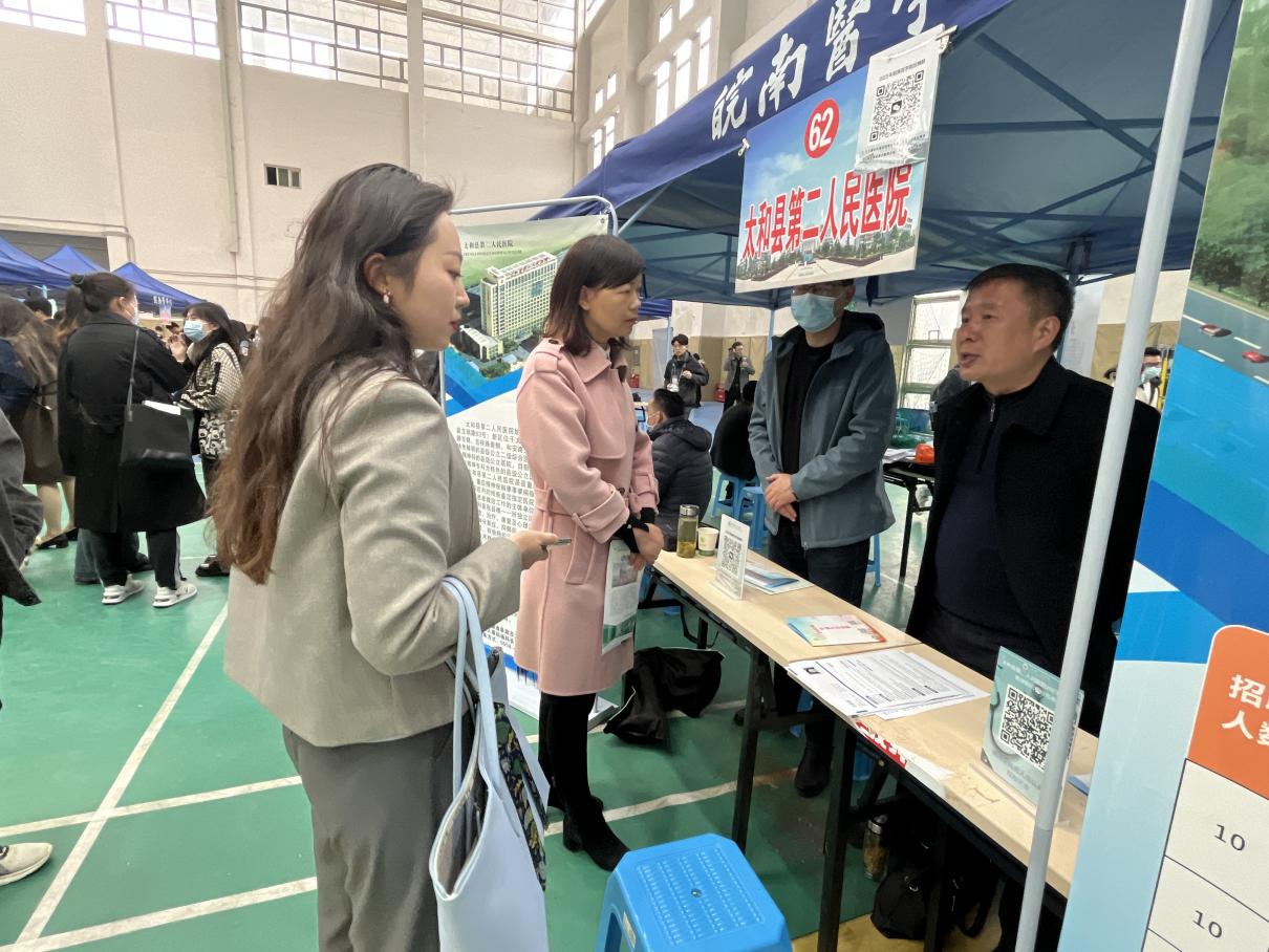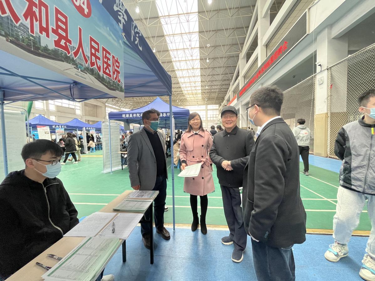 临床医公司党委书记傅万山、副书记陶香香带领毕业班辅导员以及员工工作秘书前往招聘会现场,主动与招聘单位对接开展深入交流,搭建就业平台;为毕业生提供就业指导和咨询服务,动员员工积极报名参加招聘;协助含山县人民医院、太湖县人民医院等医院做好笔试面试准备、后勤保障和考试组织工作。