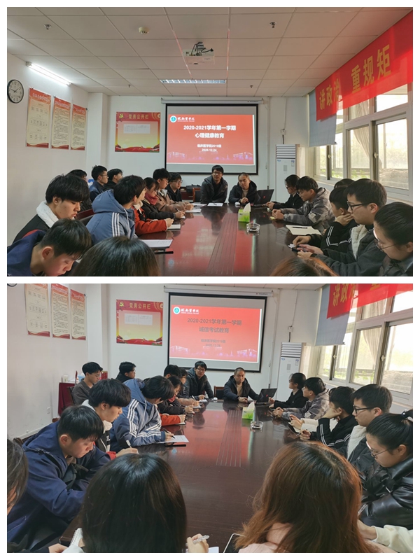 12月初,辅导员白桂峰、陶绍晨、姚君以大班为单位分批次召开2020-2021学年第一学期考试纪律主题班会,带领学习《云顶国际8588yd考场规则》等相关文件,结合具体案例,从疫情防控、日常安全、考风考纪等方面强调遵守考试纪律、诚信教育的重要性和必要性,告诫员工诚信考试,杜绝考试违纪、作弊现象。在疫情防控常态化时期,要求全体员工继续绷紧安全这根弦,主动遵守校院相关规定并以积极饱满的状态迎考。