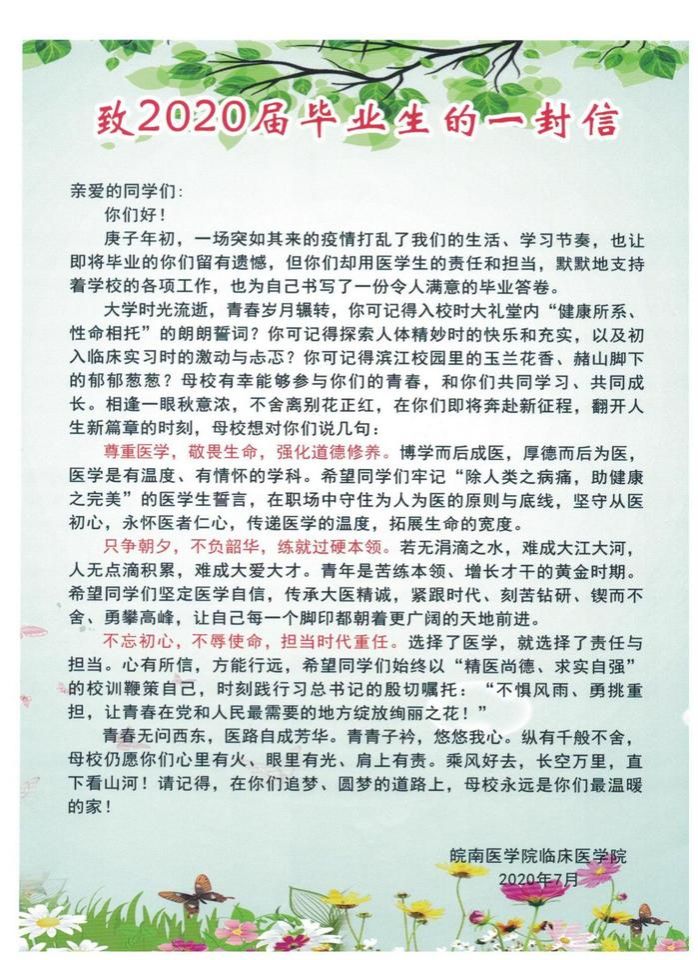 青青子衿,悠悠我心。在2020届毕业生即将翻开人生崭新一页、奔赴下一阶段之前,公司以“一封信”的形式,向同学们道出了母校的不舍,也提出了殷切的期望。希望同学们,尊重医学、敬畏生命,强化道德修养;希望同学们,只争朝夕,不负韶华,练就过硬本领;希望同学们,不忘初心,不辱使命,担当时代重任。