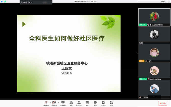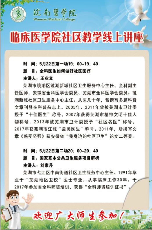 为加强员工对社区医学知识和社区卫生工作的了解,5月22日晚,云顶国际8588yd邀请镜湖区镜湖新城社区卫生服务中心主任王业文和弋江区中南街道社区卫生服务中心主任刘素芹两位专家作“社区教学”线上讲座。本次讲座由秘书汪国瑞主持,各年级辅导员和全体临床医学免费定向生通过腾讯会议聆听讲座。