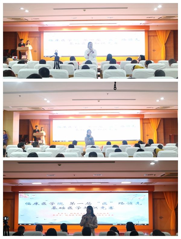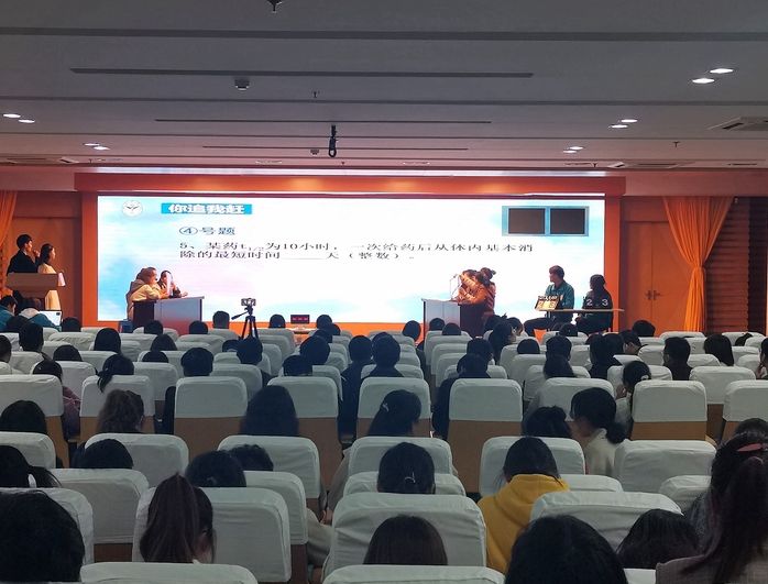 本次竞赛内容涵盖病理生理学、药理学、诊断学三门课程。竞赛分为初赛和决赛,采取团队合作方式进行比赛,受到了同学们的热烈欢迎,共有200余人参与此次比赛,经过初赛选拔,共有10支团队40名选手脱颖而出,晋级决赛。为增强比赛趣味性,决赛设置“你追我赶”、“争分夺秒”、“记忆大比拼”三个环节,采用计分排名淘汰制。在第一环节“你追我赶”中,比赛队伍两两比拼,同场竞技,选手们快速调用自己的知识储备,在规定的时间内给出答案,思路清晰,稳扎稳打。在第二环节“争分夺秒”中,每队各派一名选手进行抢答,各队选手发挥出色,互不示弱,在紧张激烈的抢答过程中,展现出扎实的知识基础和应用能力,赢得在场观众的惊叹和热烈掌声。在第三环节“记忆大比拼”中,选手们团结一心,相互配合,为取得最后的胜利拼尽全力。更有一支团队在面对还未学习过的知识点时,凭借扎实的知识储备和良好的心理素质,相互配合成功作答,体现出了团队合作的精神,同时也用实力征服了评委和观众。现场活跃的氛围也带动了观众参与的积极性,在互动环节,现场观众更是热情高涨,积极踊跃抢答,将现场再一次推向了高潮。