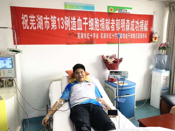 郁明森,男,2015级临床医学专业员工,安徽省六安市舒城人,在校期间多次参加无偿献血,获芜湖市无偿献血铜奖。2019年5月,郁明森同学收到中华骨髓库造血干细胞初配成功通知,决定捐献造血干细胞,在HLA高分辨配型成功、体检合格后,郁明森同学于9月19日入住云顶国际8588yd附属弋矶山医院进行为期5天的动员剂注射。9月24日上午,经过三个小时的干细胞采集手术,他完成了120毫升干细胞捐献,成为公司在校老员工第二例造血干细胞成功捐献者。