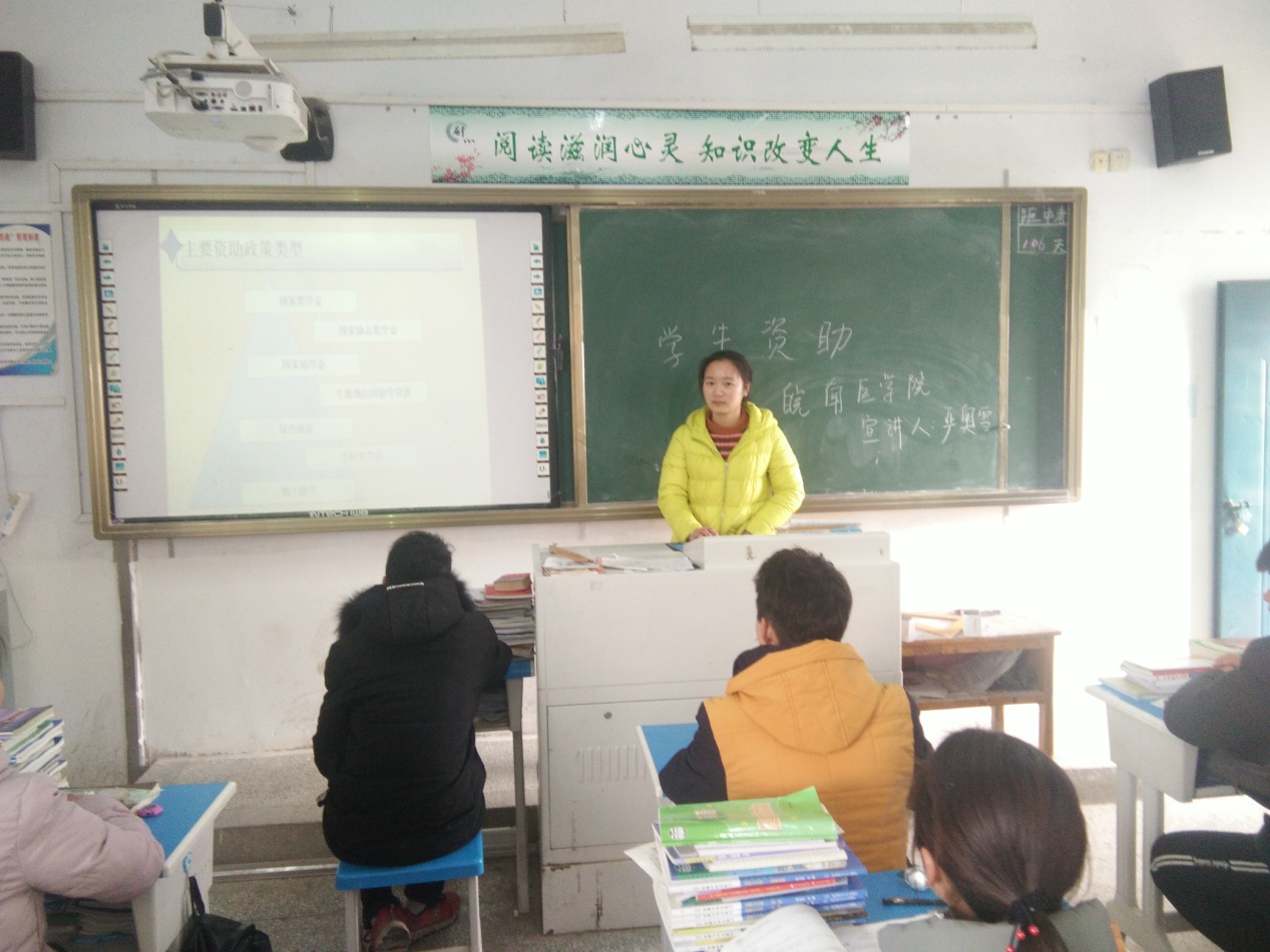 2018年2月25日下午,严奥雪同学带着精心准备的宣讲材料,回到安徽省固镇县第一中学。她首先拜访了母校恩师刘长虹,向恩师汇报了自己大学期间的学习生活情况,并表达了对母校和恩师无私培育和谆谆教诲的衷心感谢。随后,在刘长虹老师的大力支持下,严奥雪走进高二年级教室,向学弟学妹“现身说法”,详细介绍了国家以及公司员工资助的相关政策,分享了自己如何在国家资助政策的帮助下摆脱烦恼、安心学习、坚定信念、勇敢前行的经历。接着,针对同学们对于各类奖、助学金、助学贷款、勤工助学等具体事项申办的相关问题,进行了现场答疑。活动最后,她倡议全体同学写下自己的理想,时刻提醒自己把它作为前进的目标和动力,用实际行动不懈努力。