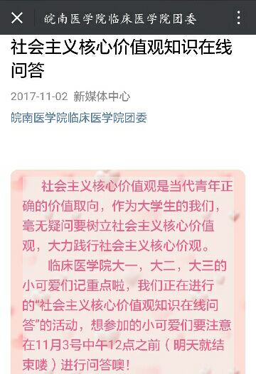 习近平总书记在北京大学考察时指出:“青年的价值取向决定了未来整个社会的价值取向,而青年又处在价值观形成和确立的关键时期,抓好这一时期的价值观养成十分重要。”为进一步弘扬和践行社会主义核心价值观,云顶国际8588yd团委联合老员工手机运用价值及引导名师工作室依托学院团委微信公众号,于10月27日-11月7日开展社会主义核心价值观知识在线问答活动。