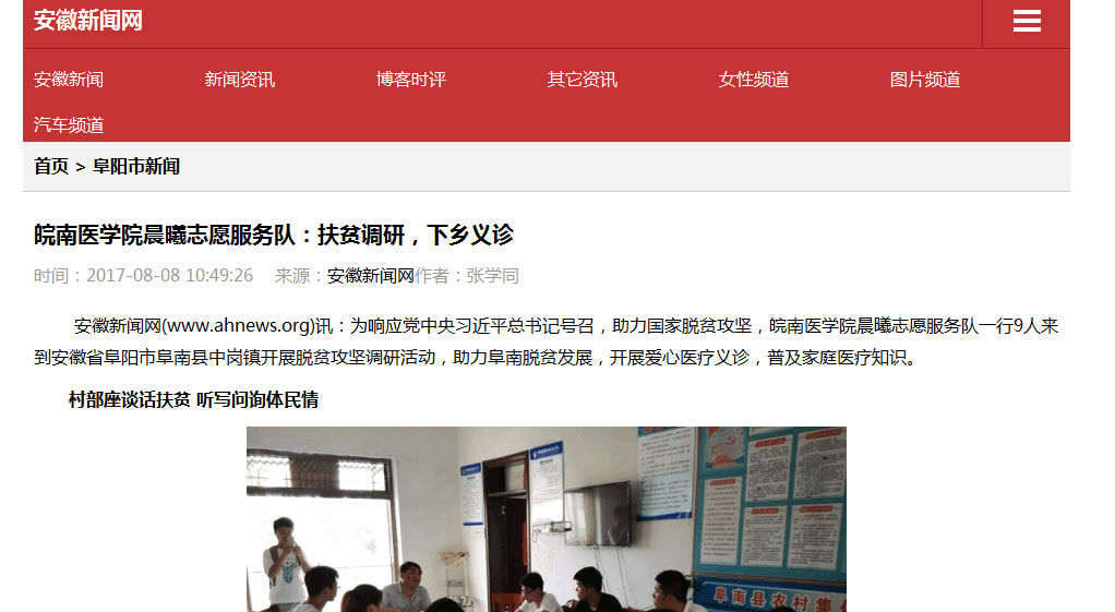 7月26号8时许,云顶国际8588yd晨曦三下乡志愿服务队阜南分队的全体成员首先到达活动第一站阜南县中岗镇新建村,开展脱贫攻坚有关的一系列的暑期三下乡活动。第二天,在驻村扶贫干部的带领下开展了精准扶贫调研活动。服务队成员首先走访村里面的几位贫困户,了解到村里每一位贫困户都要建档立卡,村干部定点联系,想尽办法全面助力脱贫。后一天,按照计划团队全体成员前往阜南县中岗镇敬老院。开展爱心医疗卫生活动,为老人们量血压、打扫卫生、宣讲医疗常识等。