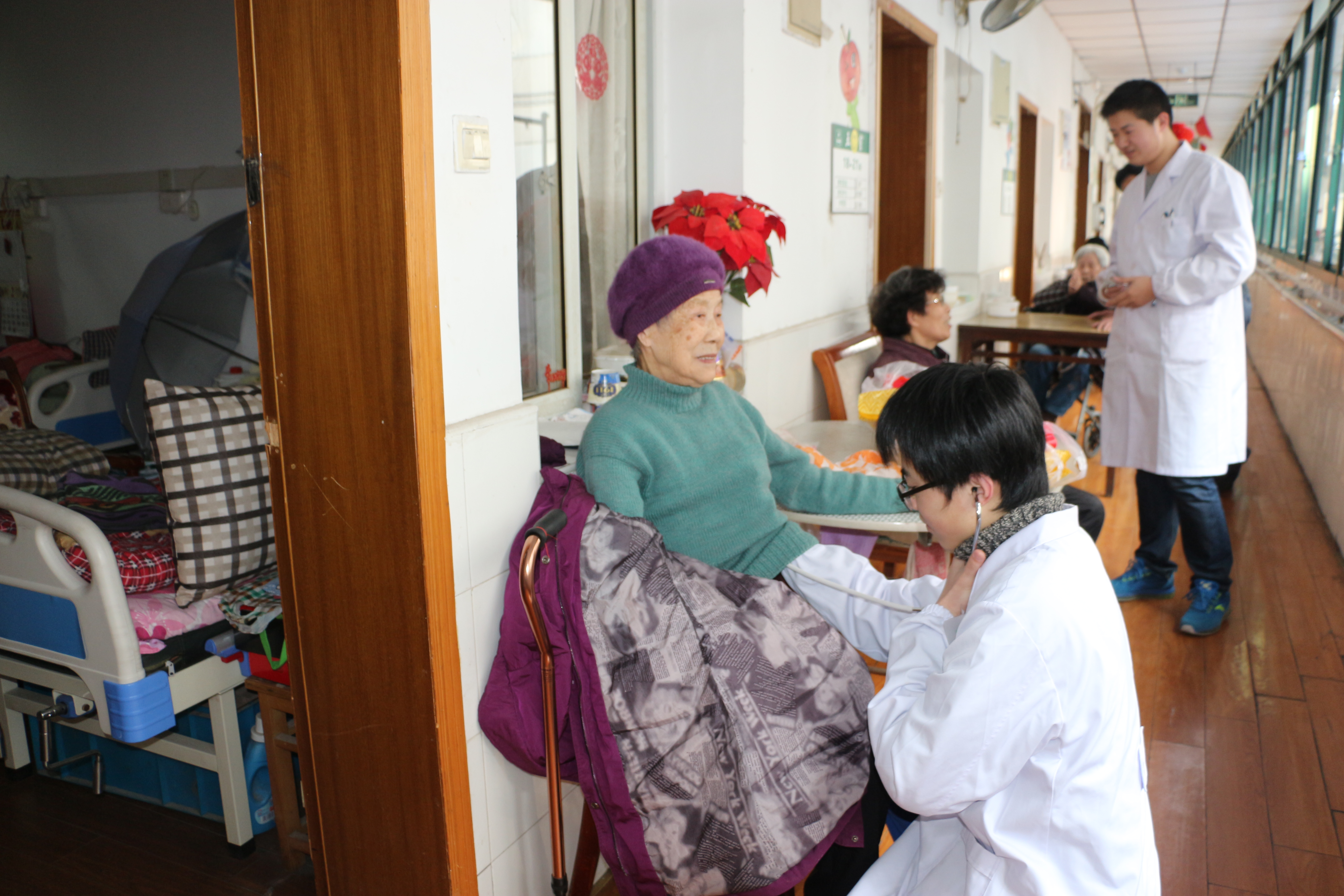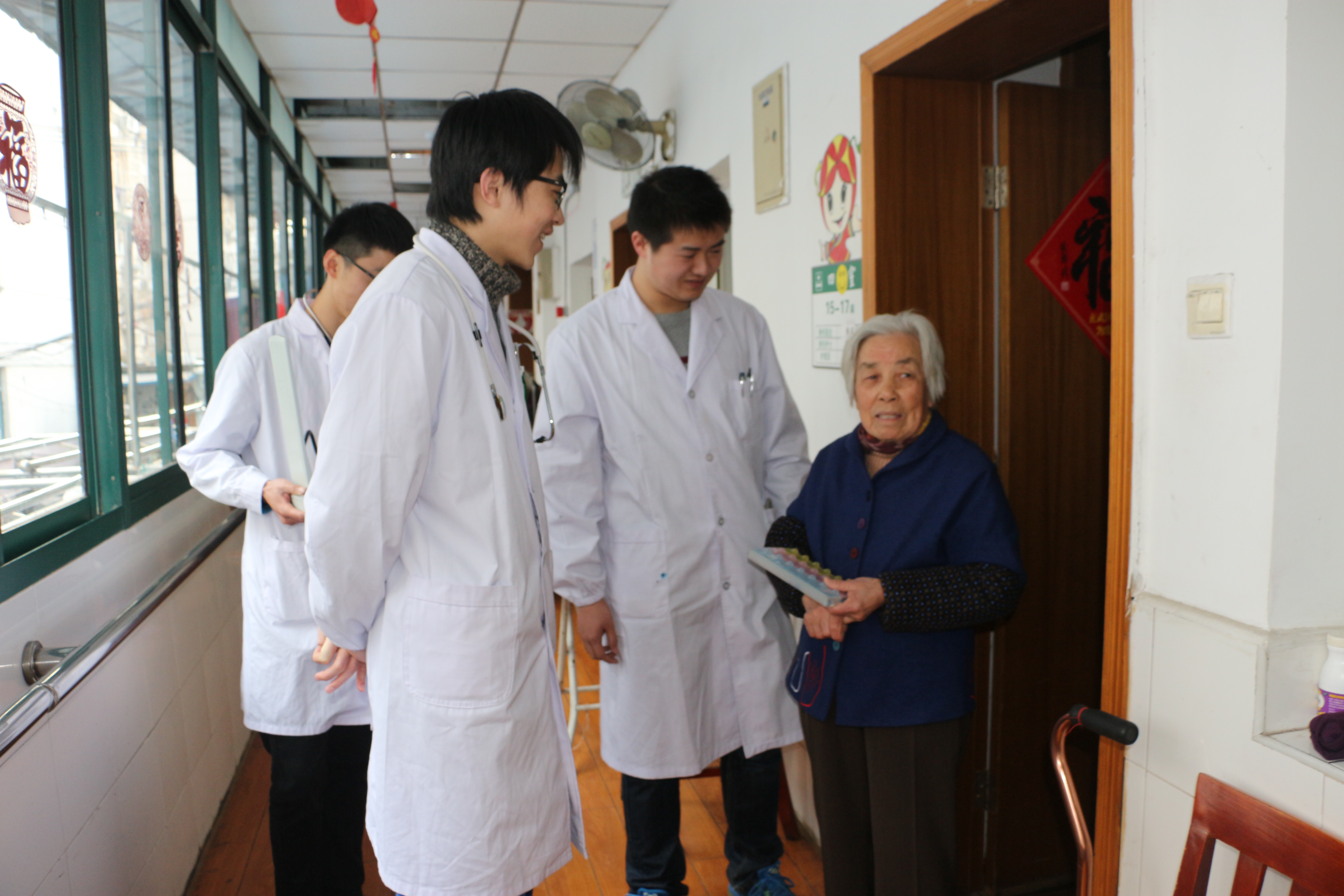 “老人家,最近身体怎么样?降压药在坚持吃没有?”3月1日下午,云顶国际8588yd、影像与检验公司的9位实习同学与南京医科大学的同学们来到梅园街道老年公寓开展志愿服务活动。他们一边给老人们进行常规检查比如量血压,听心音等,一边讲解老年人健康保健的知识,对有慢性病比如糖尿病的老人,更是关切地叮嘱平时饮食、生活中需要注意的事项。除此以外,同学们还为老人们带来了慰问品,陪他们拉家常,帮忙打扫卫生。李奶奶激动地握着同学的手说:“感谢你们来看望我们,还给我们带来慰问品,你们只要来了我们就很开心!”临走前,老人们都依依不舍,王奶奶发自肺腑地唱起了《共产党好》送别同学。