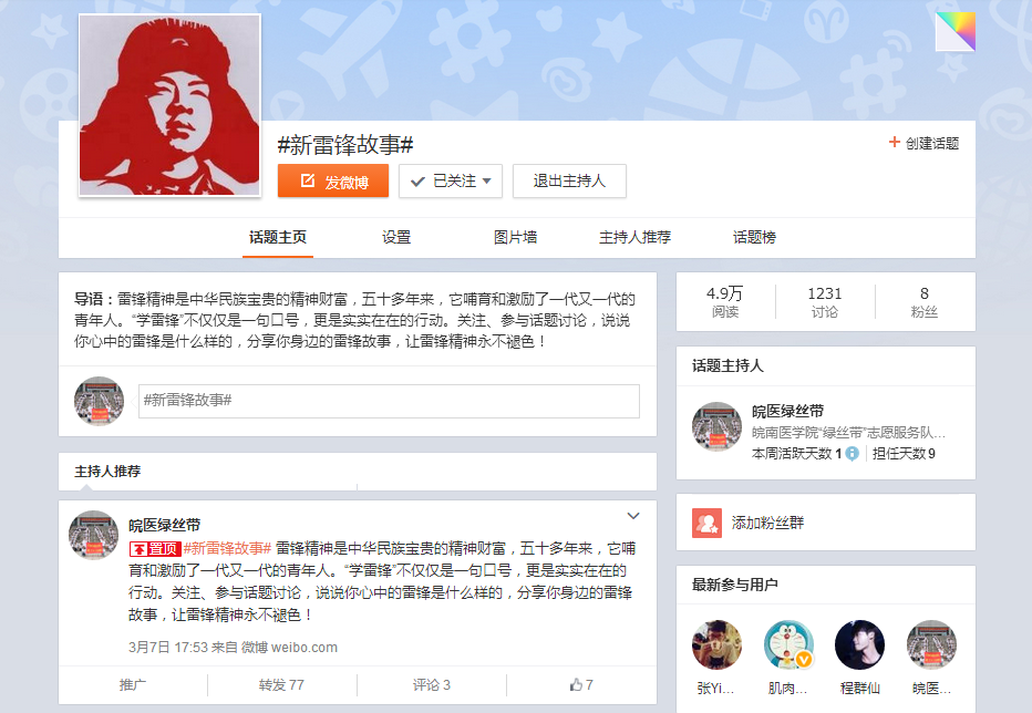 为了进一步扩大“学雷锋”活动的影响力,“绿丝带”充分发挥新媒体的传播优势,在新浪微博发起了“新雷锋故事”话题讨论,号召广大网友分享身边的雷锋故事,引发热议。在该话题下方的讨论中,有各实习队近期开展的志愿服务活动,也有社会上不断涌现出的好人好事,而更多的是同学们对新时代“雷锋精神”的理解与感悟。截至发稿时,在新浪微博搜索“皖医绿丝带”主持的话题“新雷锋故事”,共有1231条相关微博参与讨论,累计阅读量突破4.9万次。