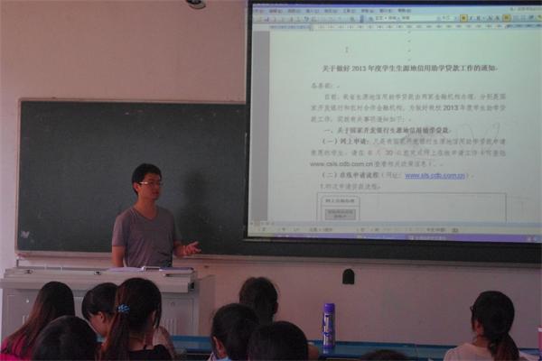 6月4日中午,2010级辅导员郭玉琼、陈健和86名有贷款意向的同学在2号教学楼204教室 召开了“2013年度员工生源地信用助学贷款”政策解读主题班会。