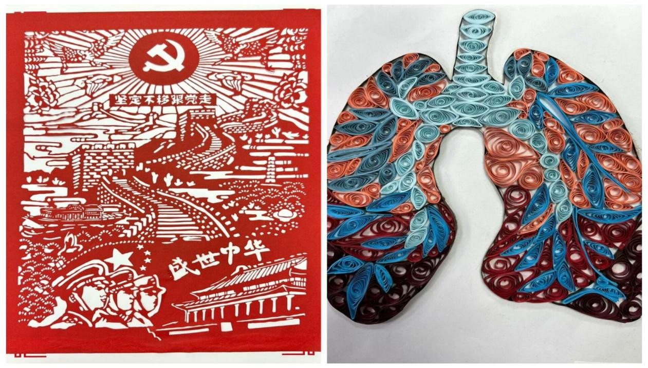 手作医心,匠心传情。除了书法和绘画这两种传统艺术形式,同学们还积极探索并运用剪纸、泥塑、衍纸、毛毡等丰富多样的材料,巧妙地将爱国之情、医学知识转化为立体而生动的作品,将心脏等复杂难理解的人体结构以直观可见的形式呈现出来,让人一目了然。同时,同学们的专业知识也在手工创作的乐趣中深刻展现,体现了医学的独特魅力与无限可能。