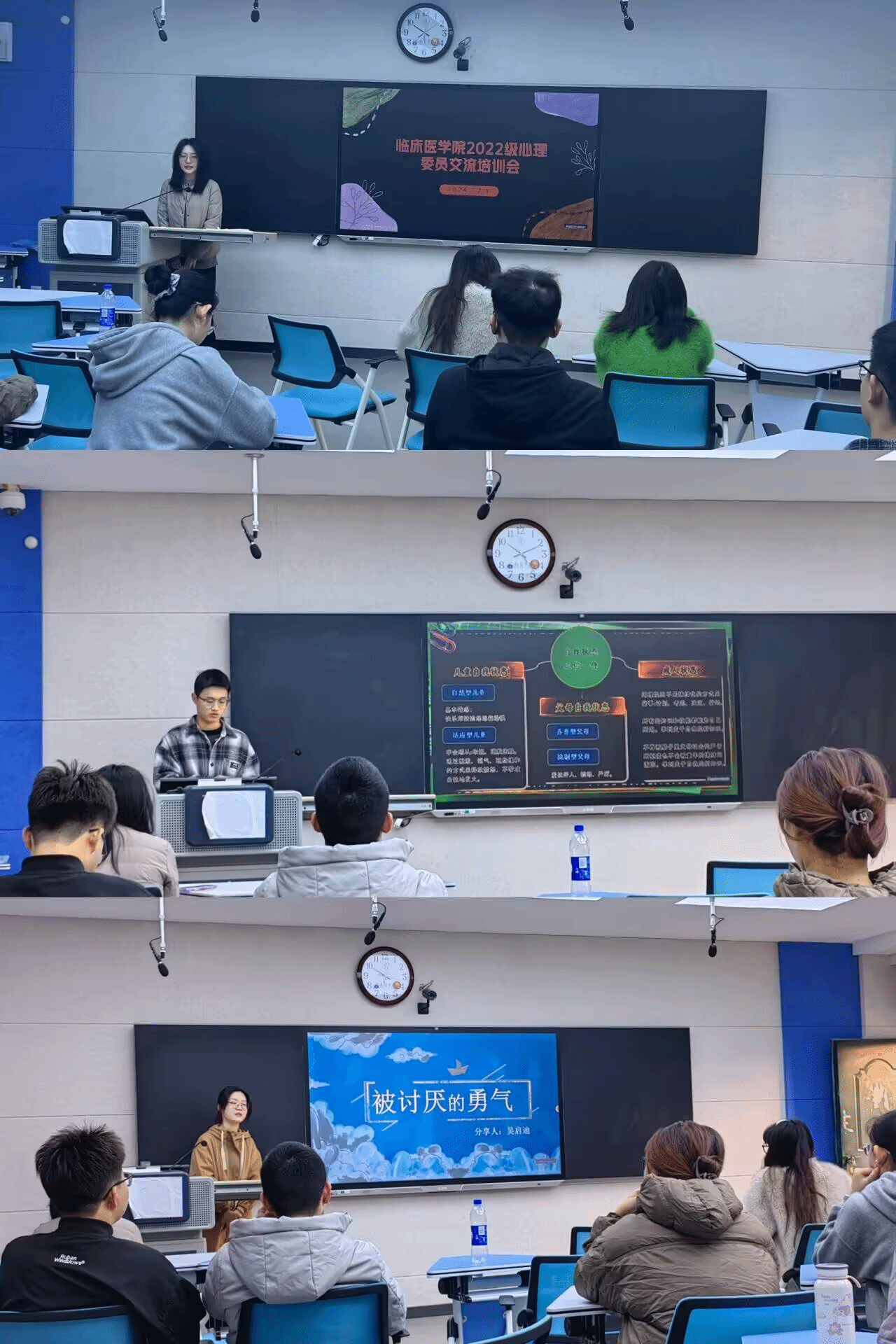 心委共融,书启智慧。心理委员读书分享会作为心理月系列活动的重要一环,为各班心理委员提供了交流平台。12月24日晚,年级心理委员们齐聚一堂,分享了各类与心理健康相关的书籍,如《蛤蟆先生去看心理医生》《被讨厌的勇气》等。他们结合书中的理论知识与实际班级工作中的案例,探讨了如何更好地识别同学们的心理状态,以及运用恰当的心理技巧进行沟通与疏导。在分享过程中,思想的火花不断碰撞,不仅加深了心理委员对心理学知识的理解,也为他们的班级心理健康工作提供了新的思路和方法,以便更精准地帮助同学们应对期末压力下可能出现的焦虑、紧张等情绪问题。