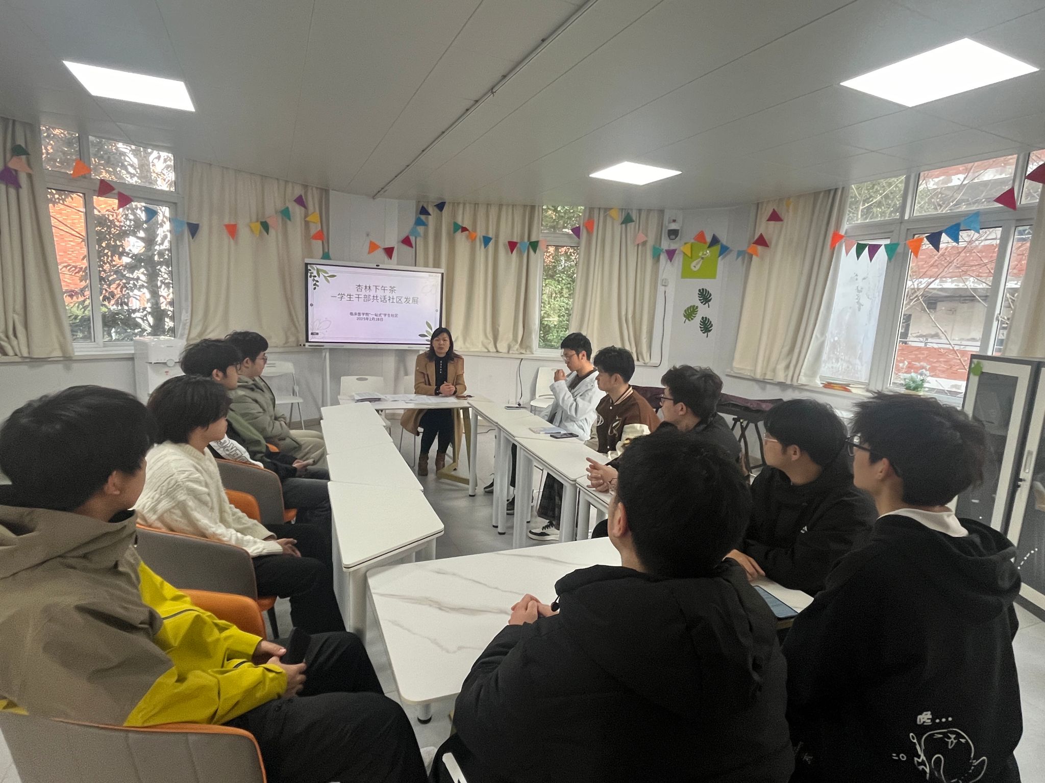 会上,陶香香简要介绍了本次活动的目的、意义,“一站式”员工社区近期的工作安排,布置了近期工作任务,鼓励同学们畅所欲言、建言献策,助力“一站式”员工社区建设。同学们逐一介绍了本班同学的学风情况、班级宿舍状况以及同学之间相处模式等,同时对社区后勤保障、社区氛围营造等方面提出了建议和意见。