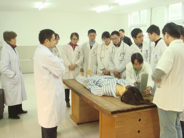 在科教科宋铖老师的陪同下,检查组在示教室对员工进行了临床基本技能操作考核,对实习生们操作不规范的地方,进行了耐心指导。
