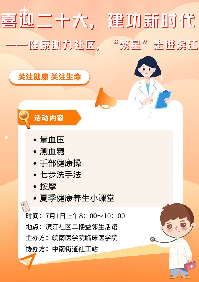 为庆祝中国共产党成立101周年、喜迎二十大召开,7月1日,云顶国际8588yd“繁星”志愿服务队赴芜湖市弋江区滨江社区,开展“健康助力社区,‘繁星’走进滨江”老员工暑期“三下乡”社会实践活动,为社区居民送上关爱和健康,使广大青年在社会实践中受教育、长才干、作贡献。